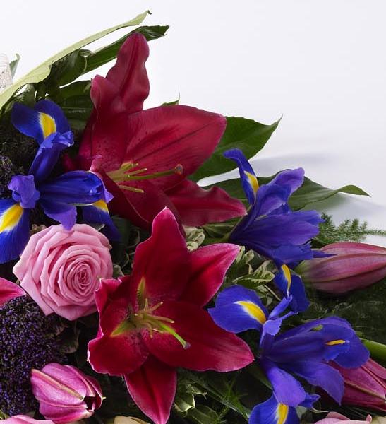 The soft blue shades of iris are complemented by pink Oriental liles, pink large-headed roses and cream lisianthus in this classic sheaf, which is tied together with a cream ribbon.