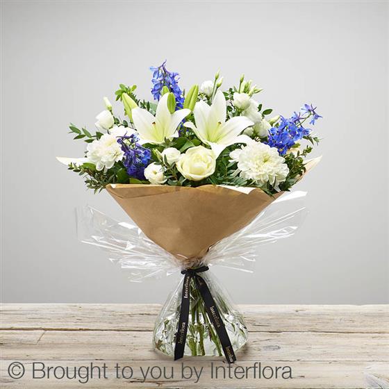 Featuring white LA lilies, white large headed roses, white chrysanthemum blooms, white lisianthus and blue delphinium, hand-tied with salal, pistache and eucalyptus, presented in Interflora Gift Packaging.