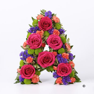 A colourful tribute letter of your choice is created using cerise short Stem roses, orange spray carnations, lime green spray chrysanthemums and blue statice, trimmed with leather leaf and pittosporum.