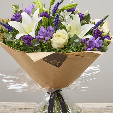 Featuring white LA lily, ivory large headed rose, purple freesia, blue veronica, purple lisianthus, eucalyptus & pistache, presented in Interflora gift packaging.