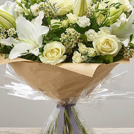 Featuring white spray roses, white oriental lilies, ivory large headed roses, white waxflower and white lisianthus with pistache and salal, hand-tied, gift-wrapped and presented in Interflora gift packaging.